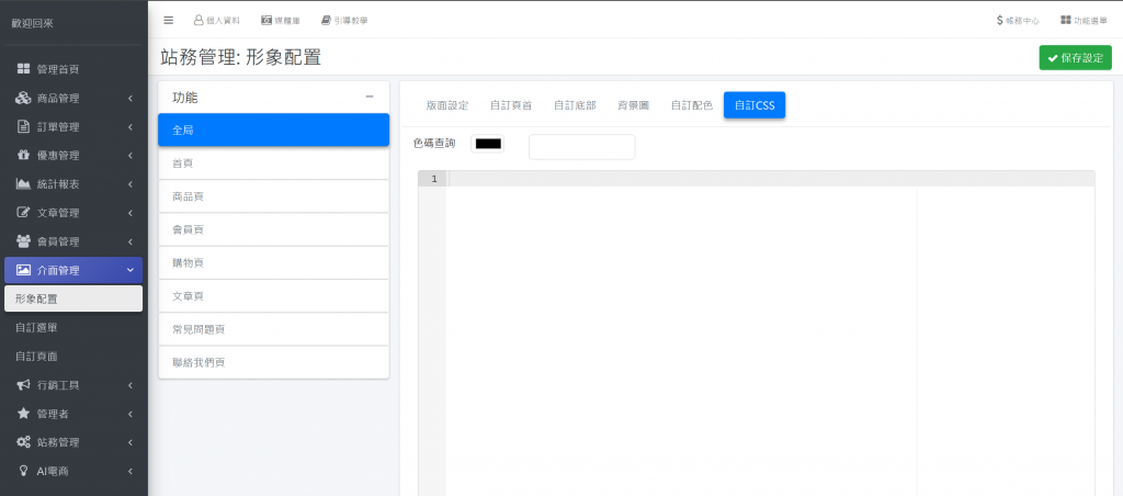 進入管理後台 > 介面管理 > 形象配置 > 全局 > 自訂CSS